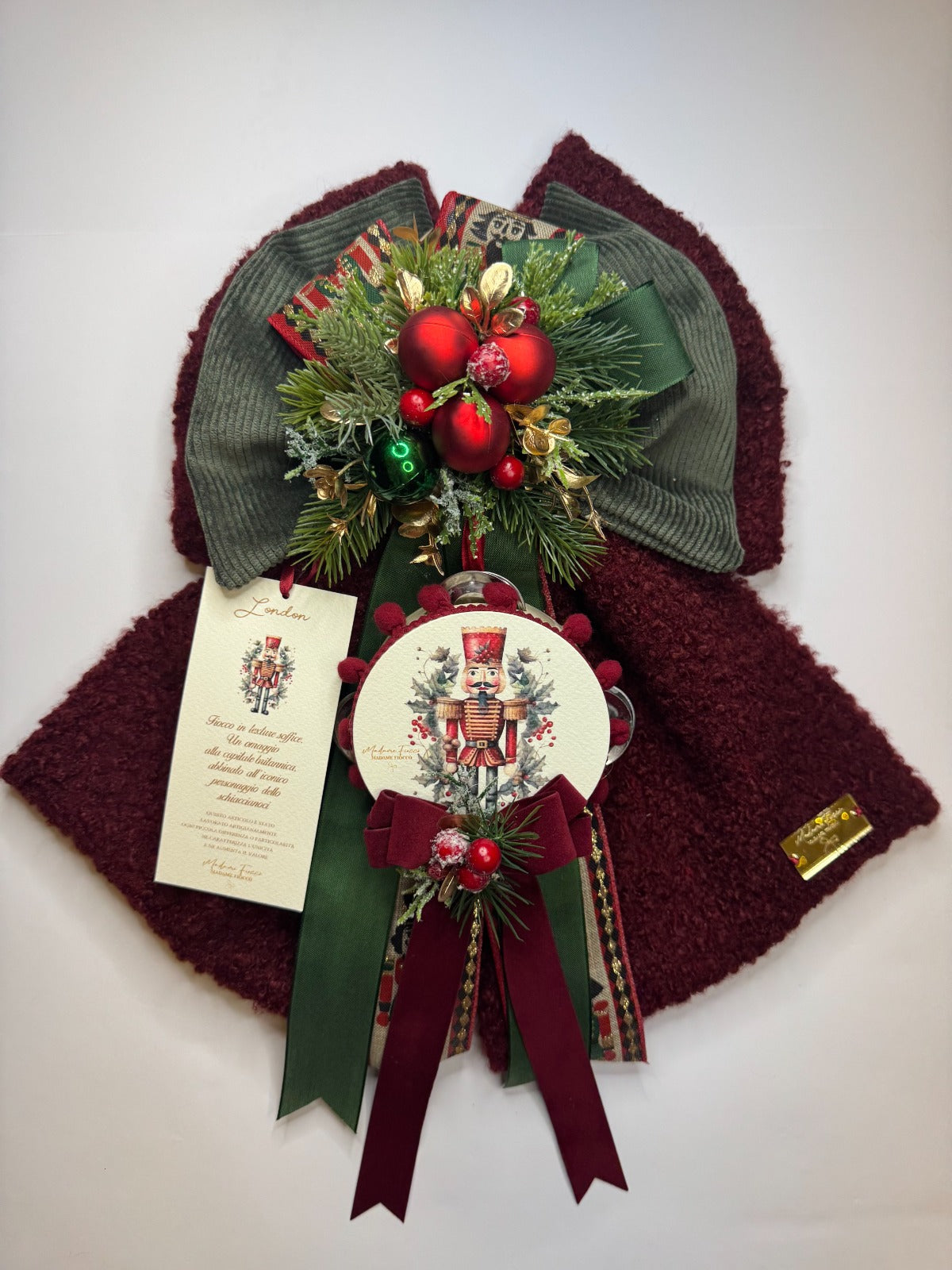 Aggiungi un tocco unico e tradizionale alle tue feste con il Fiocco Natalizio fatto a mano con Schiaccianoci, una decorazione elegante, realizzata con cura artigianale e attenzione ai dettagli.