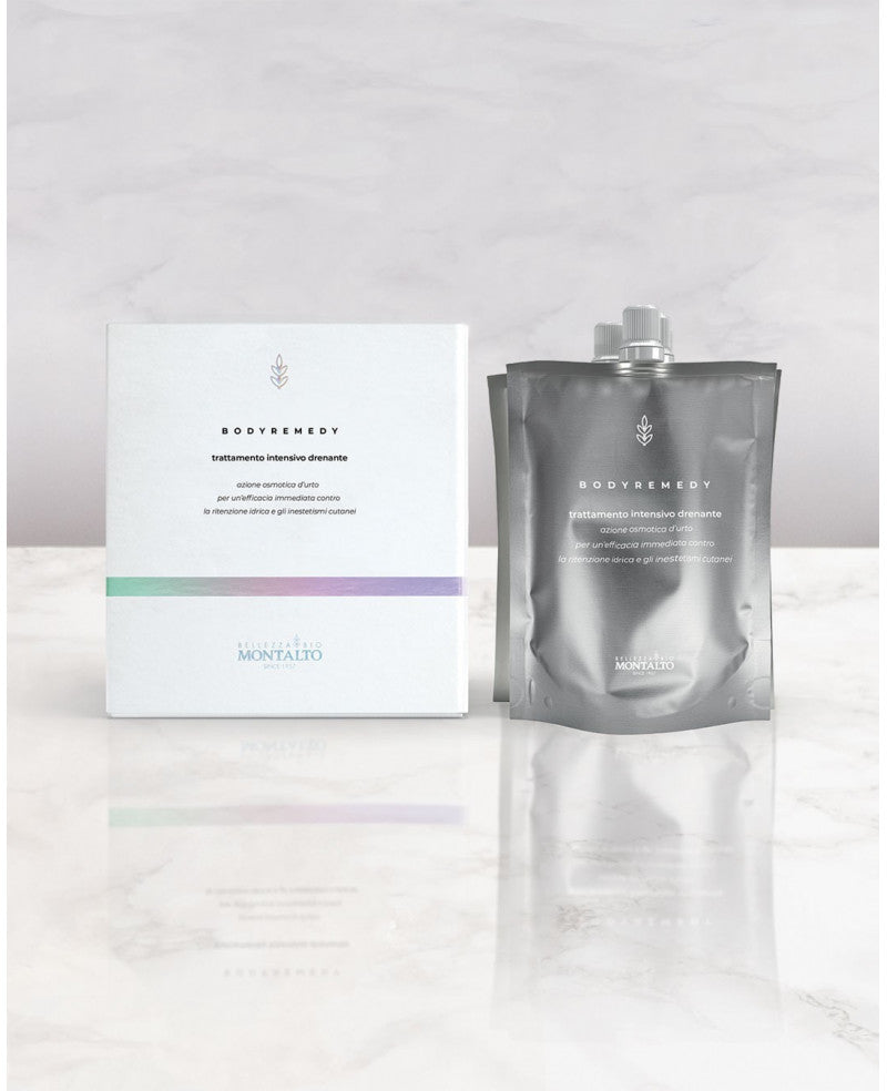 Applicare la maschera come impacco drenante seguendo il protocollo completo con le buste monodose. Dopo la rimozione, completare con la crema corpo inclusa.